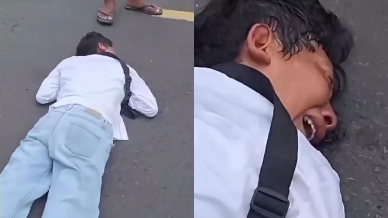 Dengan ekspresi sedih mendalam, pemuda yang belum diketahui identitasnya tersebut menjadi tontonan warga sekitar. Beberapa warga tampak memperhatikan dari pinggir jalan, sementara seorang warga lainnya berinisiatif mengatur lalu lintas demi menghindari kecelakaan.