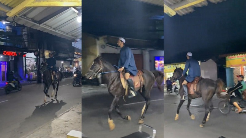 Dalam video yang beredar, pria tersebut tampak mengenakan sarung, baju koko, dan peci, dengan percaya diri menunggangi kuda di sepanjang jalan raya. Pemandangan langka ini tentu menarik perhatian para pengendara lain yang melintas, membuat banyak orang terhibur sekaligus kagum.