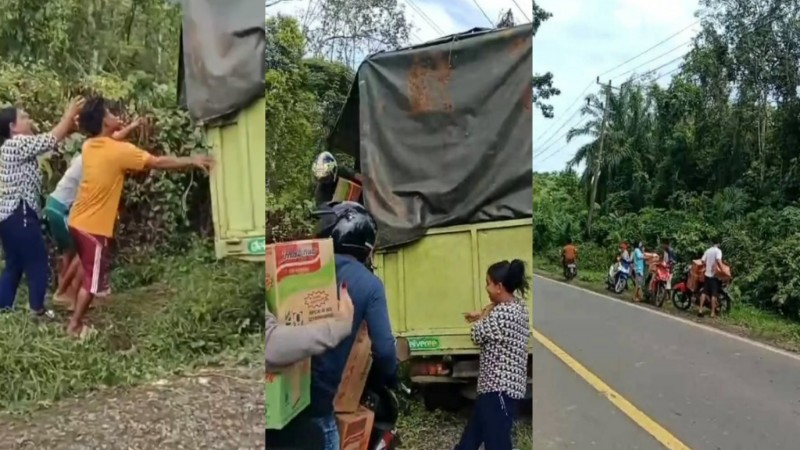 Dalam sebuah video yang beredar di media sosial, tampak sebuah truk pengangkut mie instan tanpa pelat nomor mengalami kecelakaan tunggal. Roda depan kendaraan diduga terperosok ke dalam parit. Bukannya memberikan pertolongan, sejumlah warga justru datang untuk menjarah muatan dari dalam truk.