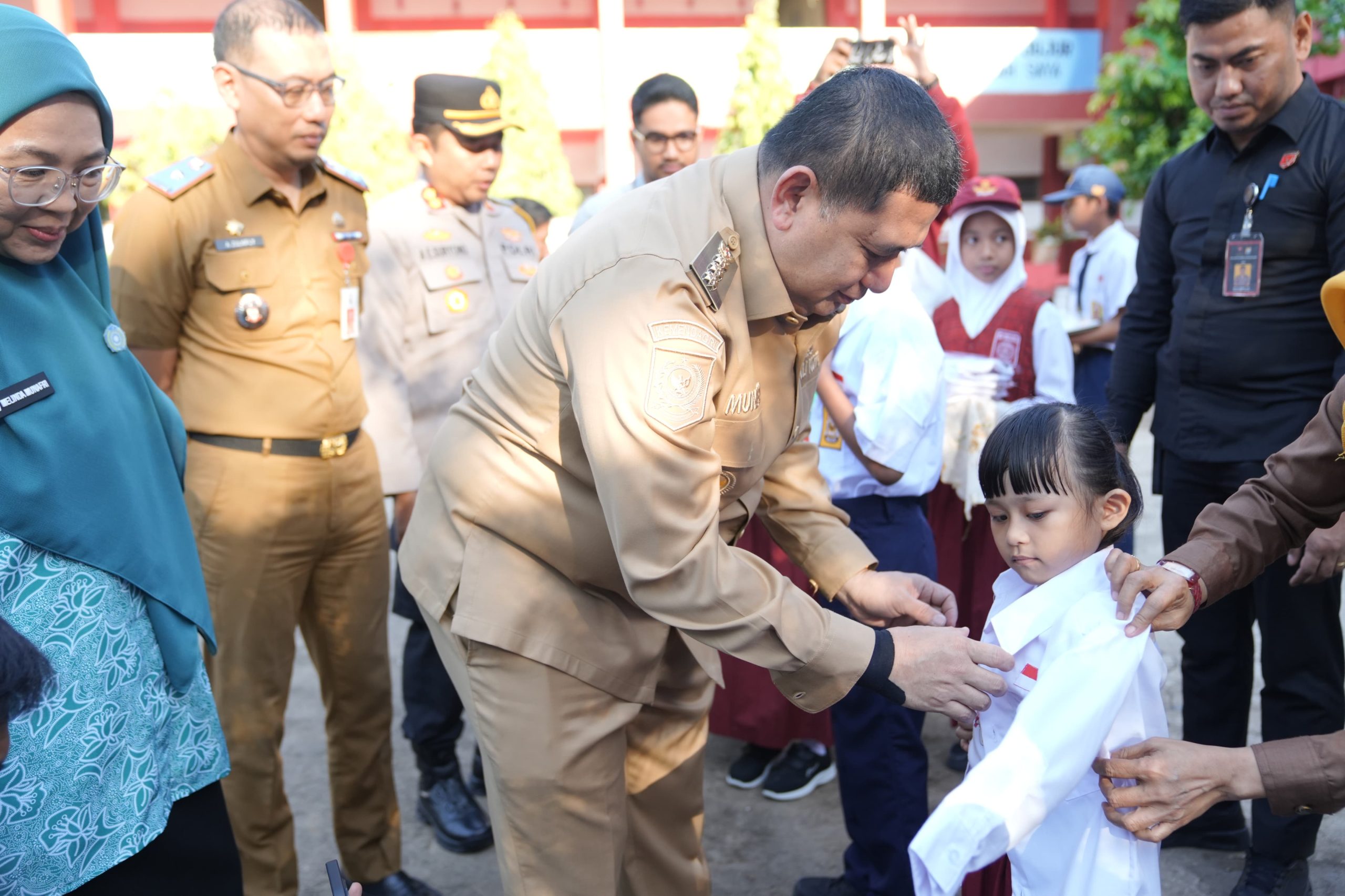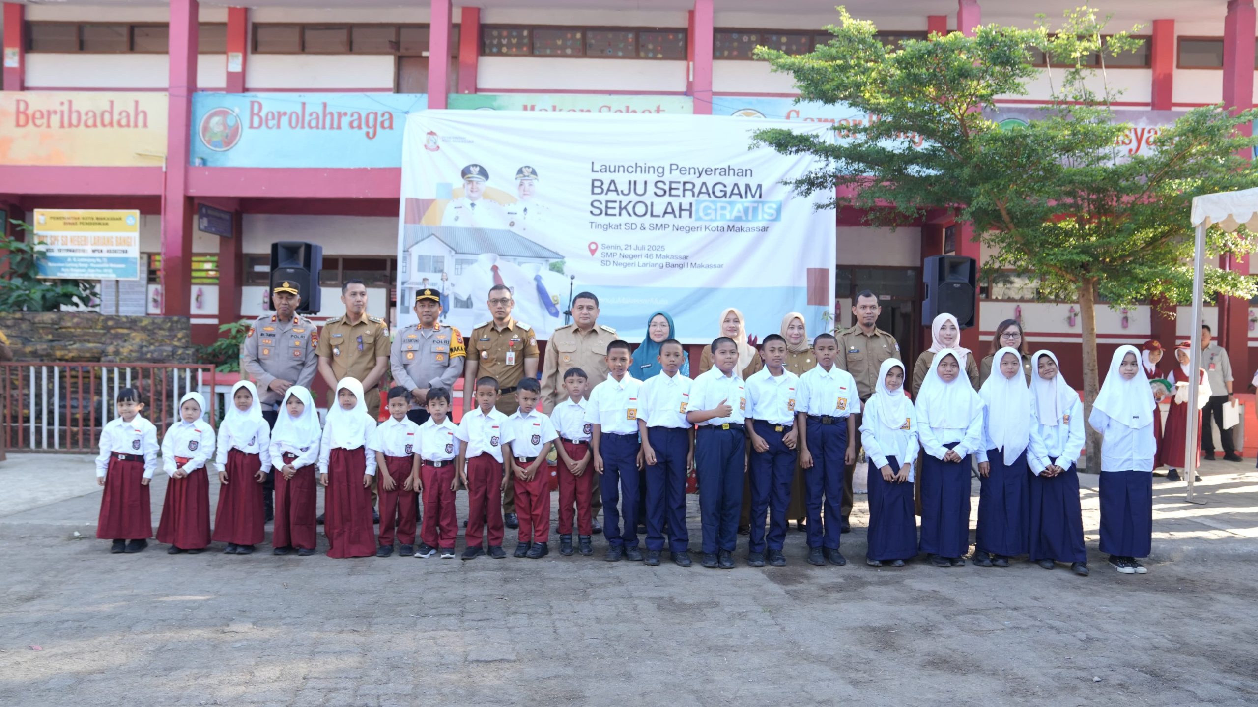 Wali Kota Makassar, Munafri Arifuddin, hadir langsung menyerahkan secara simbolis dua stel seragam seragam utama pakaian merah putih (SD) dan biru-putih (SMP).