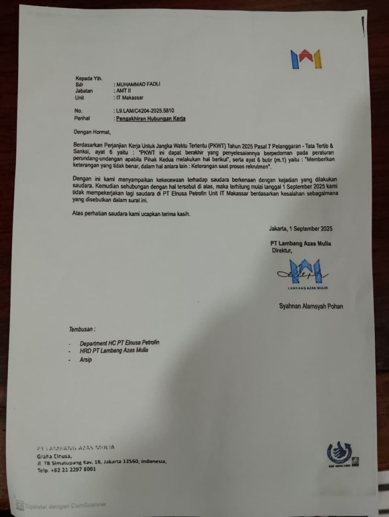 Berdasarkan surat tersebut Dua pekerja bernama Muhammad Fadli dan Rian Adrian, resmi diberhentikan oleh perusahaan rekanan Pertamina PT LAM tersebut sejak 1 September 2025, Keduanya diketahui baru bekerja sekitar tujuh bulan sebagai sopir tangki bahan bakar di Terminal BBM Makassar.