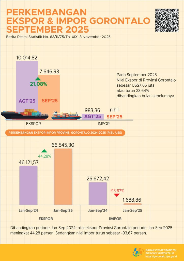 Plt. Kepala BPS Provinsi Gorontalo Dwi Alwi Astuti , mengungkapkan bahwa secara kumulatif, performa ekspor sepanjang Januari hingga September 2025 juga menggembirakan. Terjadi peningkatan sebesar 44,28% dibandingkan dengan periode yang sama di tahun 2024.